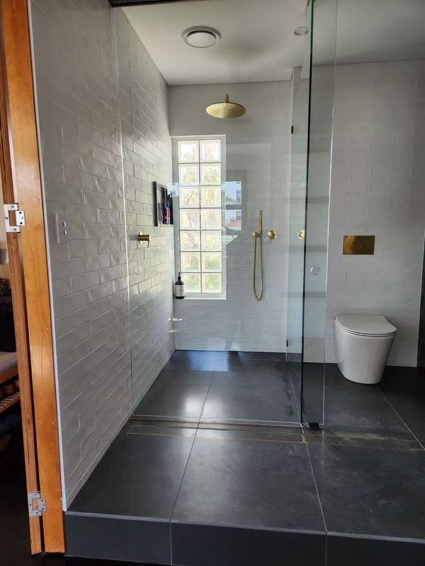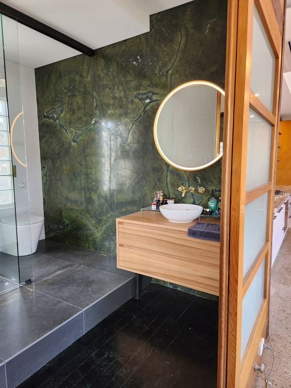 This stunning bathroom renovation in Surry Hills is a true oasis. The natural textures and warm tones create a serene and inviting atmosphere.