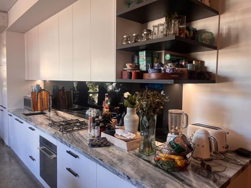The kitchen was upgraded with a modern feel that still feels like home - a perfect blend of style and practicality. The marble countertops, open shelving feature, and statement backsplash created a stylish and functional space.